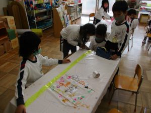 大きな凧なので、一人で作ることは難しく「そこを押さえておいて」「私がテープを貼るよ」などと声を掛け合い、協力して完成させました。