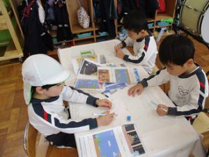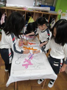 自分たちで決めたお話に合わせて、必要なものを作ったり色を塗ったりして、劇に使うものも自分たちで準備しました。