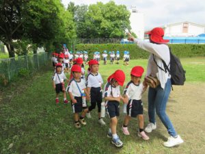 キャンパス内の散歩に出かけました。小学校の遊具を見て「大きいね」とびっくりしたり、桑の実を見つけて夢中になって拾ったりしました。小学校から中学校までぐるっと巡って散歩を楽しみました。