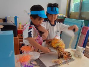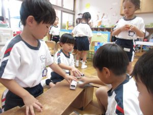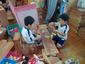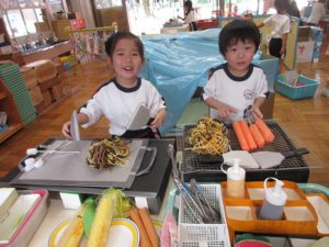 お店屋さんごっこやキャンプごっこも楽しみました。経験があるものもあるのでしょうが、なかなかの手つきで作ったりお客さんを呼んだりしていました。「いらっしゃいませ、焼きそば大盛りですね」作っている子もお客さんもとても楽しそうに遊んでいました。