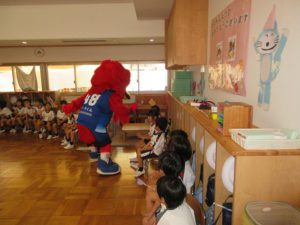 9月はいろいろな物や人に触れ合う機会がありました。ファイティングイーグルスのリードくんが来てくれたり、人形劇を見たりしました。どの子も目を輝かせて見たり、お話の世界にしっかり入り込んで楽しんだりしていました。