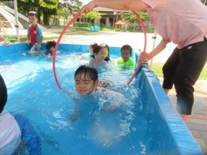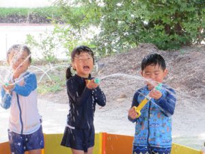 9月はまだ暑かったので、水遊びをたくさん楽しみました。夏休みの間に少し泳ぐことができたり水に顔をつけたりできる子も増え、みんなうれしそうに遊びました。水鉄砲では思い切り遠く打ち上げ花火のように水を飛ばして遊びました。
