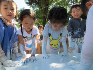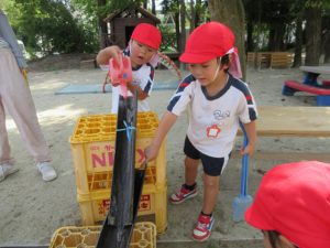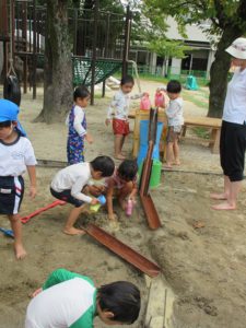 トイを使って水を流すことも楽しみました。角度やトイの組み合わせを考えながら水の流れを追ったり「すごい、すごい、もっと水流して」と声を掛け合ったりして楽しんでいました。
