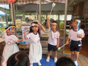 「私たちプリキュアよ」とアイドルになりきってショーをしたり、少し恥ずかしいけど仲良しの友達と好きな曲に合わせて体を動かすことを楽しんだりしました。いろいろなものを取り入れて伸び伸びと自分を表現できるって素敵ですね。
