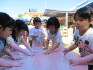 フィンガ―ペイントも楽しみました。始めは恐る恐る指に絵の具を付け、そしてだんだん大胆にぐるぐると絵を描いて楽しみました。顔や体に付ける子もいて、水色やピンクの顔になっていた子もいました。いつもと違う遊びに大喜び。終わった後は洗濯ごっこも楽しんでいました。