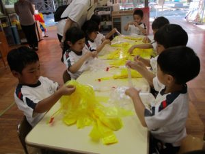 自分で作ったポンポンを持って、踊ると「音が鳴るね」「ふわふわだね」とうれしそうでした。