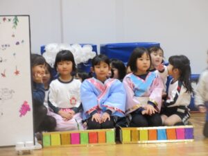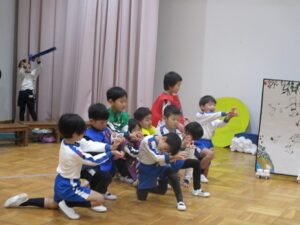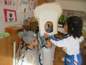 友達と気持ちを合わせて楽しんだ生活発表会。たくさんの方に見てもらって、うれしかったです。生活発表会でいろいろなクラスの劇を見せてもらい、生活発表会の後は、さっそく、いろいろなクラスの劇に入れてもらったり、衣装を貸してもらったりすることを楽しみました。憧れの年長さんと一緒に動いたり優しくしてもらったりすることがうれしくて、終始ニコニコの子どもたちでした。