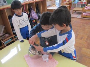 憧れの年長さんがあと少しで修了してしまうことを知り、みんなで「おわかれパーティー」をすることにしました。看板や飾りを作ろう! プレゼントをあげたい! 手紙が書きたい! 一緒に遊びたい! ご飯を食べたい!など、様々な考えが出てきました。どんなことをすると年長さんが喜んでくれるかを考えて、一生懸命に準備しました。当日は、案内や司会、配膳など大活躍。自分たちで大きなプロジェクトを成し遂げたような満足感で、どの子も自信に満ちた顔をしていました。