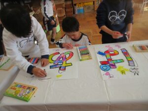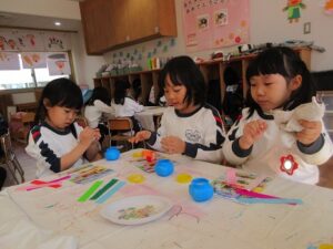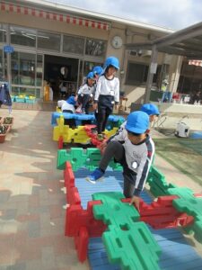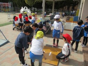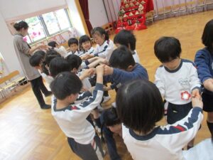 遊びや生活の中でも、年長さんにいろいろなことを教えてもらいました。当番のやり方、こま回しや一輪車、ドッジボールやマルチパネなど、一緒に遊んだり教えてもらったりして楽しかったね。年長組になったらどんなことができるのかな?期待が膨らみますね。