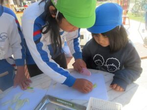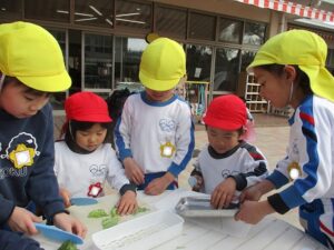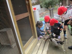 年長さんから、カモ当番のやり方を教えてもらいました。今までは年長さんがカモのお世話をしてくれていたことを知り、憧れの気持ちがさらに強くなりました。包丁の使い方、何を食べるのか、どれくらいの大きさに切るのかなど、様々なことを優しく丁寧に教えてもらいました。カモをそっと触ってみたり、エサを食べる様子を喜んで見たり、年長さんと一緒にうれしい時間を過ごしました。